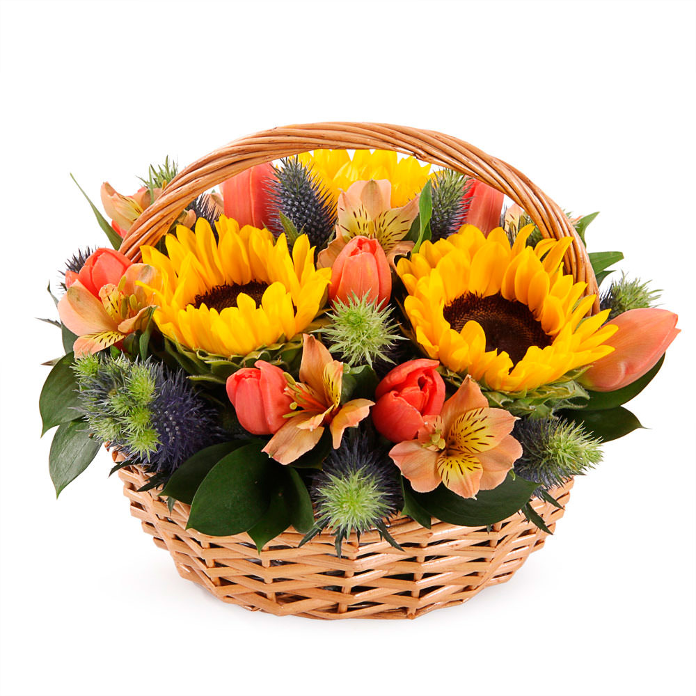 Подсолнух, тюльпан, альстромерия, эрингиум.